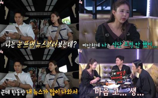 코요태 신지가 26일 방송된 '전참시'에 출연해 "한동안 내 뉴스가 너무 많이 나와서 안 봤다" "마음고생을 해서 살이 빠졌다" 등과 같은 발언으로 자신과 예비 신랑을 둘러싼 논란을 간접적으로 언급했다. /방송화면 캡처 |
