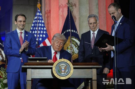 [워싱턴=AP/뉴시스] 도널드 트럼프 미국 대통령이 7월 23일 워싱턴의 앤드루 W. 멜론 강당에서 열린 AI 정상회의에 참석해 연설한 뒤 AI 관련 행정명령에 서명하고 있다. 뉴욕법원은 트럼프 행정명령 중 인문학기금 지급중단과 환수에 제동 명령을 내렸다. 2025.07.27.