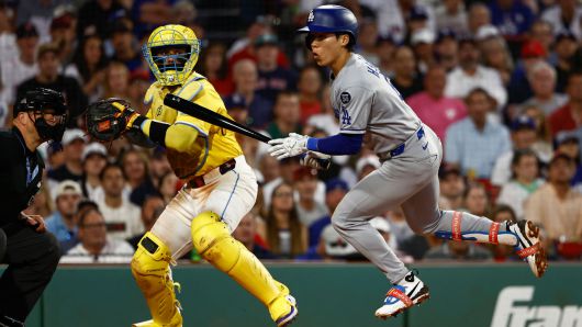 ▲ 보스턴 레드삭스의 포수 카를로스 나르바에스(75번)가 경기 3회 초, 로스앤젤레스 다저스의 김혜성(6번)이 높고 몸쪽으로 들어오는 공을 피한 직후 1루 주자를 견제하려고 하고 있다.
