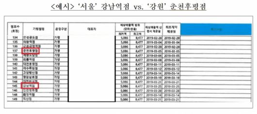 예컨대 2019년 1월3일부터 11월22일까지 체결된 116개 가맹계약에서 각 가맹점주들이 받은 점포예정지별 예상매출액의 범위 정보는 2018년에 6개월 이상 운영된 전국 전체 이차돌 가맹점의 평균매출액을 기준으로 산정된 것으로 모두 동일했다. 서울 강남 소재 가맹점이나 강원 춘천 소재 가맹점 모두 예상매출액 범위를 '연간 전용면적 1㎡당 508만6000~847만7000원'으로 제공받은 것이다.