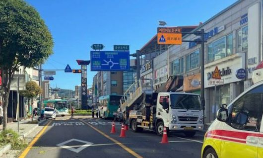 사고가 난 도로는 편도 1차로 옆으로 평행주차 공간이 마련된 형태인데, 고소작업차는 주차공간에 걸쳐서 정차 중이었던 것으로 파악됐다.