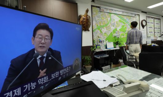 지난 3일 서울 강남구 한 부동산중개업소에서 이재명 대통령의 첫 기자회견 방송이 나오고 있다. (사진=연합뉴스) |