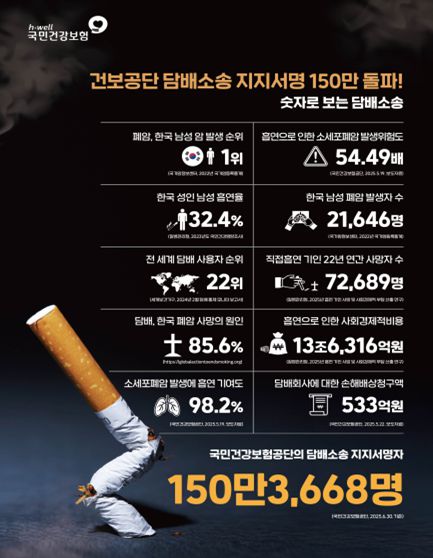 국민건강보험공단이 국내외 담배회사와 12년째 이어온 500억 원대 '담배 소송' 2심 판결을 앞두고 국민 150만 명의 지지 서명을 제출했다. 그동안 국내에서 환자·유족이 제기했던 소송은 모두 담배회사가 이겼던 만큼, 1심의 판단을 뒤집기 위해 안간힘을 쓰고 있다.