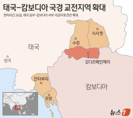 태국과 캄보디아는 지난 24일부터 국경에서 부딪히고 있다. 100년 넘게 영유권 분쟁을 벌여온 국경 지대에서 태국 군인들이 캄보디아 측이 매설한 것으로 추정되는 지뢰 폭발로 중상을 입은 사건이 도화선이 됐다. /사진=뉴스1 |