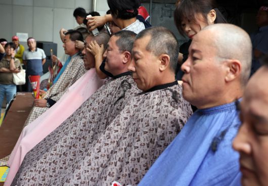 전북 전주·완주 통합을 추진 중인 김관영 전북도지사의 '도민과의 대화'가 예정된 지난달 25일 완주군청사 앞에서 완주군의회 의원 10명이 통합을 반대하며 삭발하고 있다. 연합뉴스 |