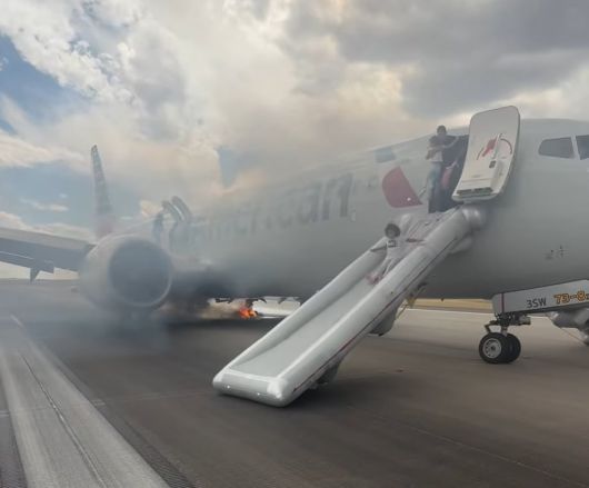 미국 아메리칸항공 여객기 바퀴에서 불이 나 승객들이 비상 대피하는 사고가 발생했다.