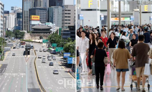 [이데일리 방인권 기자] 본격적인 휴가철을 맞은 27일 서울역 주변 도로가 한산한 모습(왼쪽)을 보인 반면 인천국제공항 제1여객터미널 출국장은 해외여행객으로 붐비고 있다.