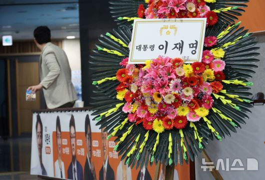 [서울=뉴시스] 김명년 기자 = 27일 오후 개혁신당 제2차 전당대회가 열리고 있는 서울 여의도 국회 의원회관 대회의실 앞에 이재명 대통령의 축하 화환이 놓여 있다. 2025.07.27. kmn@newsis.conm