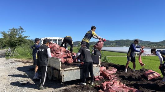 30도가 넘는 폭염 속에서도 이른 아침부터 구슬땀을 흘리며 침수 피해를 입은 농가 복구에 힘을 보탰다. 한창 시즌이 진행 중임에도 선수들이 피해 주민들을 돕기 위해 휴식을 반납한 건 이례적이다.