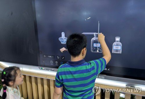 (상하이=연합뉴스) 정성조 특파원 = 27일 중국 상하이에서 열린 '2025 세계인공지능대회' 전시장에 전시된 가상 과학 실험용 AI 칠판. 2025.7.27