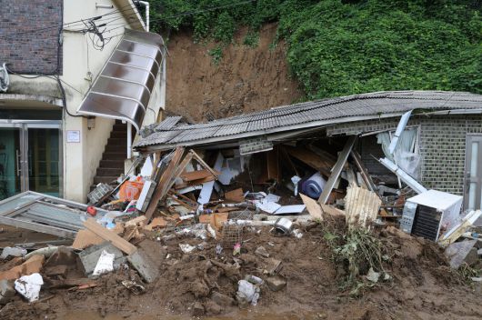 지난 20일 오후 경기도 가평군 조종면에서 새벽 시간에 쏟아진 폭우로 산사태가 발생해 주택이 파손되어 있다. 연합뉴스 |