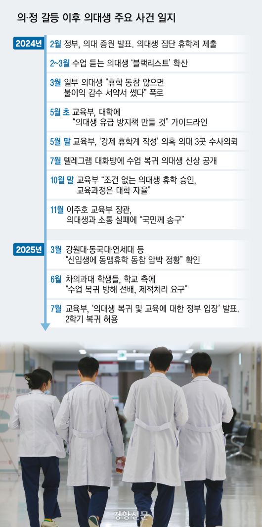 지난해 2월 윤석열 정부의 의대 정원 2000명 증원에 반발해 집단 휴학계를 제출했던 의대생들이 1년 5개월만에 수업에 복귀하게 되면서, 의사 수급과 환자 건강권을 무기로 삼은 ‘의대 불패’가 이번에도 재확인됐다. 정부는 수업·실습의 단축과 압축, 의사국가시험(국시) 추가 응시 등 대학들의 제안을 대부분 수용했다. 긴 동맹휴학에도 별다른 제재나 대국민 사과 없이 의대생들이 사실상 특혜를 받아 복귀하게 되면서 의료계의 집단 이기주의와 특권 의식이 더 공고해졌다는 분석도 나온다.