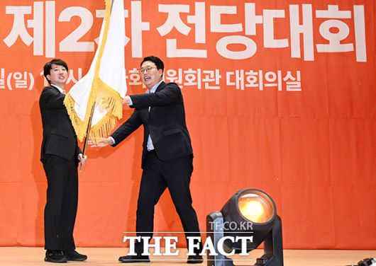 [더팩트ㅣ국회=남용희 기자] 개혁신당 신임 당대표로 선출된 이준석 의원이 27일 오후 서울 여의도 국회 의원회관 대회의실에서 열린 개혁신당 제2차 전당대회에서 당기를 흔들고 있다.