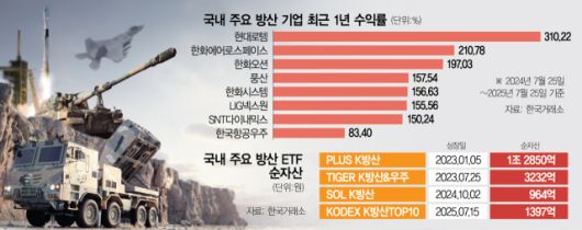 실제 국내 주요 방산 기업들의 25일 기준 최근 1년 주가 상승률은 상장 기업 최상위권이다. 이 기간 현대로템(064350)의 주가는 무려 310.22% 상승했다. 한화에어로스페이스(012450)(210.78%), 한화오션(042660)(197.03%), 풍산(103140)(157.54%), 한화시스템(272210)(156.63%), LIG넥스원(079550)(155.56%) 등 대다수 기업의 주가 상승률은 세자릿수다. 같은 기간 ‘PLUS K방산’의 수익률은 188.94%로 국내 상장된 ETF 전체 중 1위를 차지했다. 코스피 지수 상승률(15.85%)의 10배가 넘는다.