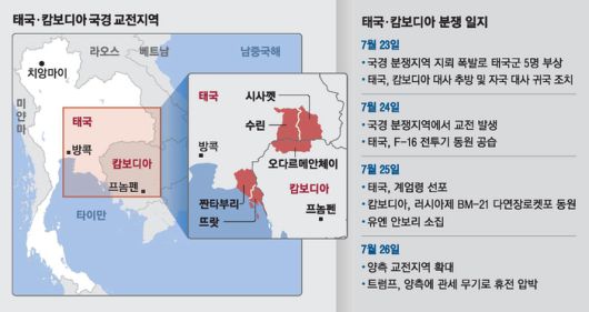 양국은 지난 23일 국경에서 지뢰 폭발로 태국 군인 5명이 다친 뒤 24일부터 본격적인 교전을 벌이고 있다. 지금까지 양국에서 최소 33명이 사망한 것으로 알려졌다. 양국은 817㎞에 이르는 국경과 고대 사원의 소유권 문제로 수십 년간 갈등을 빚어왔다.