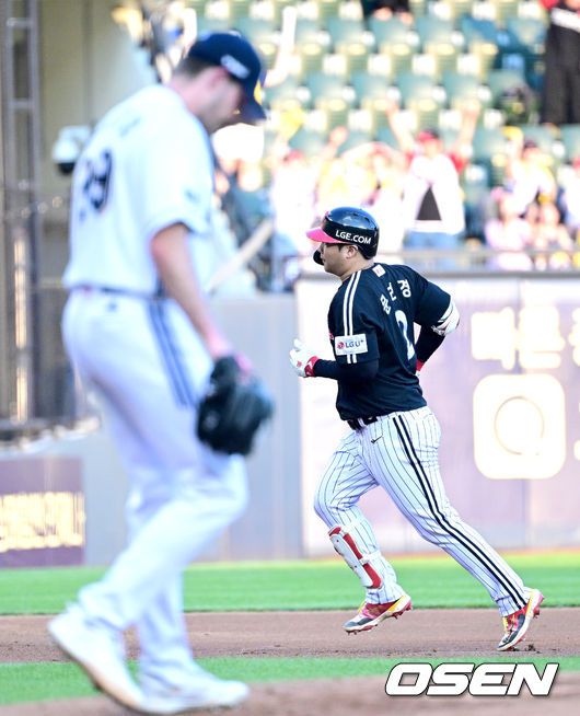 [OSEN=잠실, 최규한 기자] 27일 서울 잠실야구장에서 ‘2025 신한 SOL Bank KBO리그’ 두산 베어스와 LG 트윈스의 경기가 열렸다. 홈팀 두산은 잭 로그, 방문팀 LG는 최채흥을 선발로 내세웠다. 3회초 무사 1, 2루 상황 LG 문보경이 두산 선발 잭 로그를 상대로 달아나는 우월 스리런포를 날리고 그라운드를 돌고 있다. 2025.07.27 / dreamer@osen.co.kr