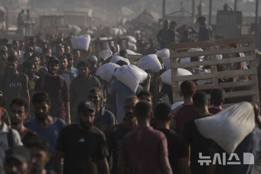 [AP/뉴시스] 26일 가자 북쪽 봉쇄선에서 진입한 구호트럭으로부터 밀가루 포대를 얻은 팔레스타인 주민들이 가자 시티 쪽으로 돌아가고 있다 |