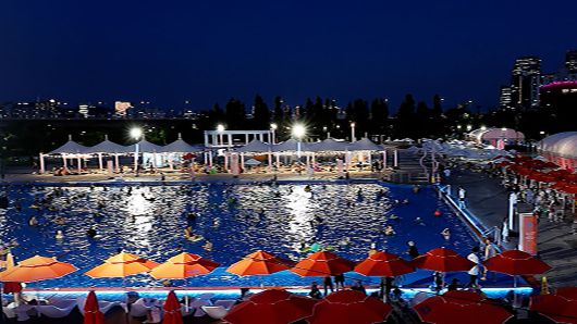 낮에는 더위가 심해서 한강공원에 시민분들을 거의 볼 수 없었지만 해가 지고 나니까 이렇게 제 뒤에 보시는 것과 같이 물놀이를 즐기러 많은 분들이 나왔습니다.