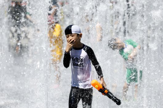 “여기는 시원해요” 서울 한낮 기온이 38도까지 오르는 등 전국 곳곳에서 역대급 폭염을 기록한 27일 어린이들이 서울 광화문광장 바닥분수에 뛰어들어 물놀이를 하고 있다. 문재원 기자 mjw@kyunghyang.com |