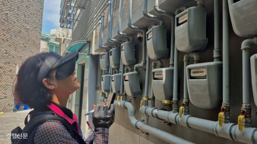 도시가스 점검원 배수옥씨가 한낮 폭염을 견디며 서울 동작구 주택가를 돌며 가스계량기를 검침했다. 다가구주택 외벽에 설치된 계량기를 살피며 숫자를 입력하던 그의 몸은 곧 땀범벅이 됐다.
