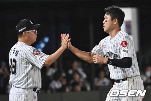 [OSEN=부산, 이석우 기자] 27일 부산 사직야구장에서 2025 신한 SOL 뱅크 KBO 리그 롯데 자이언츠와 KIA 타이거즈의 경기가 열렸다. 홈팀 롯데는 나균안이, 방문팀 KIA는 네일이 선발 출전했다.롯데 자이언츠 전준우가 KIA 타이거즈에 5-3으로 승리, 스윙승을 올리고 김태형 감독과 하이파이브를 하고 있다. 2025.07.27 / foto0307@osen.co.kr |