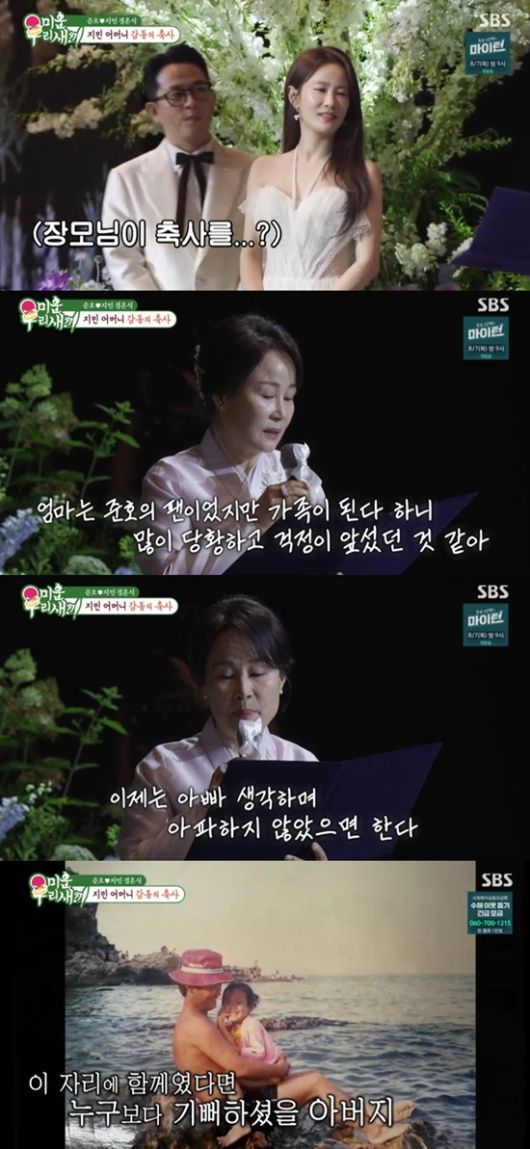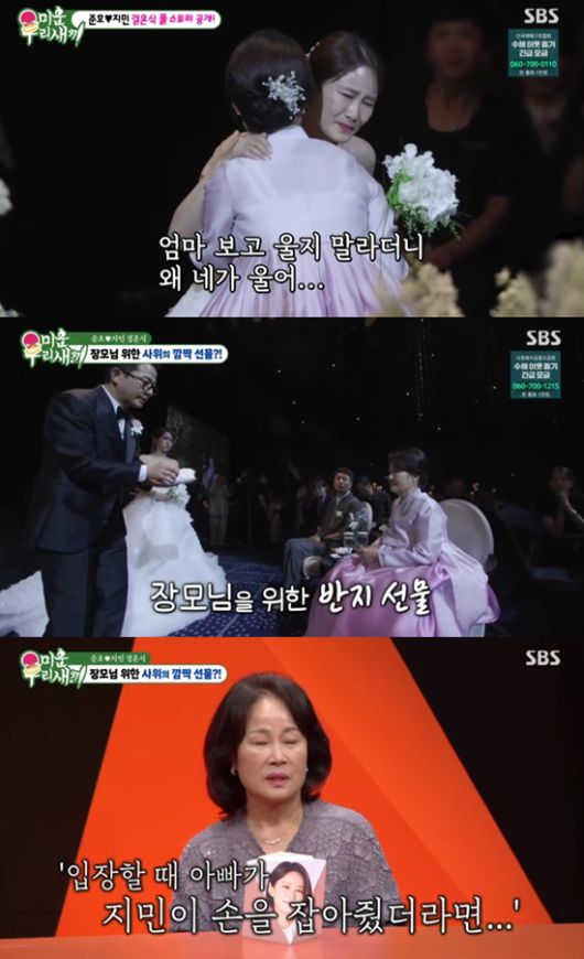 김지민 어머니는 "지민이가 평생 한 번 있는 결혼식 입장을 하면서 아빠가 손을 잡아줬더라면. (김)대희 씨가 해줘서 고맙지만 많은 아쉬움이 있다"면서 눈시울을 붉혔다.