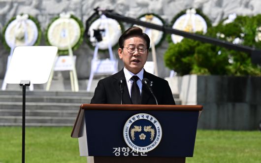 이재명 대통령이 지난달 6일 서울 동작구 국립서울현충원에서 열린 제70회 현충일 추념식에서 추념사를 하고 있다. 대통령실사진기자단 |