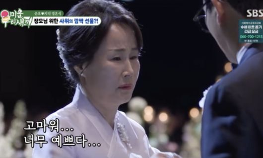 이때 분위기를 바꾼 깜짝 이벤트가 이어졌다. 바로 김지민 모친이 몰래 준비한 서프라이즈 축사였다.