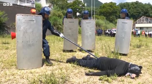 지난 21일 일본 도치기현에서 경찰과 수렵 단체 회원 등이 곰 퇴치 합동 훈련을 진행하는 모습. 경찰이 총에 맞아 쓰러진 곰 역할을 맡은 남성을 막대기로 찔러 반응을 확인하고 있다. /BBC 캡처 |