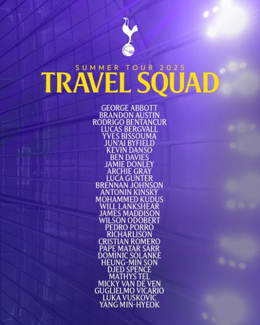 한편 데스티니 우도기, 타카이 코타, 마노르 솔로몬, 라두 드라구신, 데얀 쿨루셉스키, 브리안 힐은 재활을 위해 훈련장에 남으며, 마이키 무어, 데바인 스칼렛은 임대 이적의 기회를 모색하기 위해 이번 투어에 참가하지 않는다.
