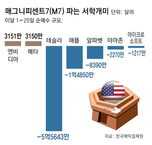 반면 서학개미들은 미국 대표 기술주인 M7을 매도 중인 것으로 나타났다. 이달 들어 서학개미는 M7 종목 중 엔비디아(3151만 달러 순매수)와 메타(3150만 달러 순매수) 등 두 종목만 순매수했고 나머지 다섯 종목은 순매도했다.