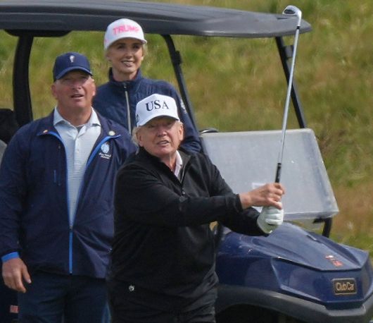 26일(현지 시간) 도널드 트럼프 미국 대통령이 자신이 소유한 스코틀랜드 턴베리의 골프장에서 골프를 치고 있다. 트럼프 대통령은 27일 현지에서 우르줄라 폰데어라이엔 유럽연합(EU) 집행위원장을 만나 무역협상 담판에 나섰다. 턴베리=AP 뉴시스 |