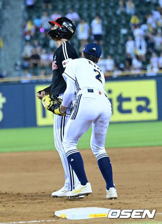 [OSEN=잠실, 민경훈 기자] 25일 오후 서울 잠실야구장에서 2025 신한 SOL Bank KBO리그 두산 베어스와 LG 트윈스의 경기가 열렸다.이날 두산은 콜어빈, LG는 에르난데스를 선발로 내세웠다.8회초 1사 주자 1루 LG 문보경 타석에서 1루 주자 김주성이 도루를 시도했으나 런다운에 걸리며 태그아웃을 당하고 있다. 2025.07.25 / rumi@osen.co.kr