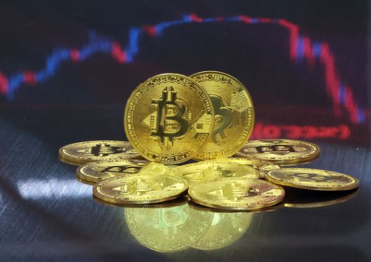 지난 23일 오후 서울 강남구 서초구 빗썸라운지 강남본점에서 비트코인 모형이 놓인 바닥에 코인 시세 그래프가 비치는 모습. 뉴스1 |