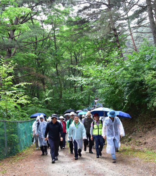 남부지방산림청과 경북 봉화군, 주민 등이 지난달 22일 봉화 국립백두대간수목원에서 개최된 동서트레일 47구간 걷기 행사에 참여하고 있다. 47구간은 국립백두대간수목원을 지나는 길이 15㎞ 코스다. 남부산림청 제공 |