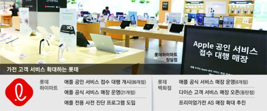 롯데하이마트가 국내 유통 업계 최초로 ‘애플 공인 서비스 접수 대행’을 전국 110개 점포로 확대한다. 고객 수요가 높은 가전의 서비스를 강화해 고객 접근성을 높이기 위해서다. 롯데백화점도 다이슨 서비스 매장을 개점하는 등 프리미엄 가전 사후 서비스(AS) 역량 강화를 추진한다. 단순한 제품 판매를 넘어 고객 경험을 개선하는 서비스 경쟁력을 키우겠다는 전략이다. 롯데 유통군은 글로벌 브랜드와 파트너십을 통해 고객 체류 시간을 늘리고 고객 충성도를 높이겠다는 각오다.