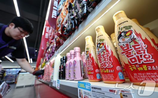 서울 마포구 CU 홍대상상점 라면 라이브러리에 매운 라면 소스제품이 진열돼 있다.. 2025.7.3/뉴스1 ⓒ News1 김도우 기자 |
