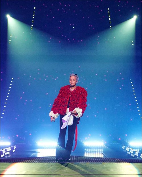 또 다른 사진에서는 수백 송이의 장미로 장식된 붉은 재킷을 걸치고, 한 손에 흰 손수건을 쥔 채 런웨이처럼 무대를 걷는 모습이 담겼다. 마지막 장면에선 팬들과 스태프들이 둘러싼 가운데, 붉은 로브를 입은 채 환호를 받는 지드래곤의 뒷모습이 담겨 깊은 인상을 남겼다.