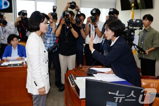 24일 오전 서울 여의도 국회 과학기술정보방송통신위원회에서 열린 이진숙 방송통신위원장 후보자 인사청문회에서 최민희 위원장이 이 후보자가 선서문을 제출할 때 인사를 하지 않고 가자 다시 불러 얘기하고 있다. 2024.7.24/뉴스1 ⓒ News1 안은나 기자 |