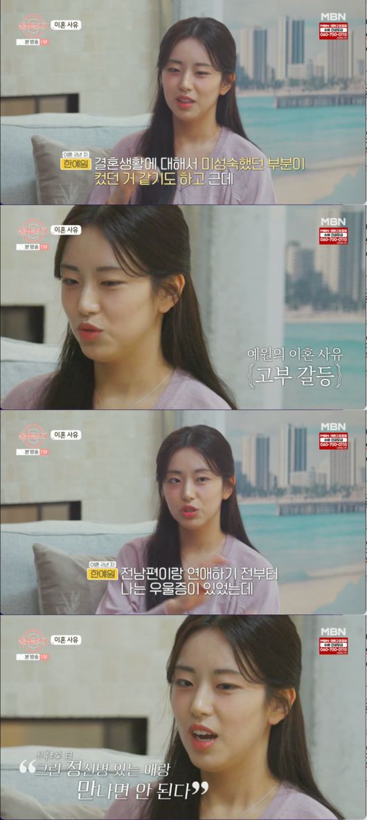 이혼 사유에 대해 예원은 "결혼 생활에 대해서 미성숙했던 부분이 컸던 것 같다"며 자신의 이혼 사유에 대해 운을 뗐다. 이어 그녀는 고부 갈등이 심각했다고 밝히며, "전 남편이랑 연애하기 전부터 나는 우울증이 있었는데, 시부모님께서 아시고 '그런 정신병 있는 애랑 만나면 안 된다'고 하셨다는 걸 내가 알게 됐다"고 말해 충격을 안겼다.