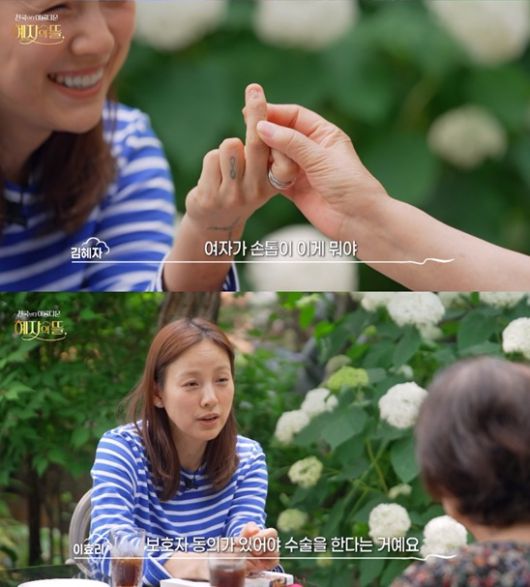 이효리는 "우리 개들 싸우는 거 말리다가 여기 손이 거의 잘렸다. 병원에 입원했다. 신경 다 끊어지고"라고 털어놨다. 이어 중지 손톱을 들어보인 이효리에 김혜자는 놀라며 "손톱이 이게 뭐냐"고 안타까워했다.