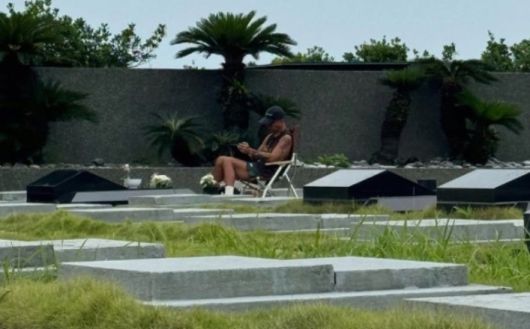 사진 속에서 구준엽은 서희원 묘 앞에 캠핑용 의자를 놓고 앉아 액자로 추정되는 물품을 바라보고 있다.