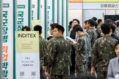 7일 경기 고양 킨텍스에서 열린 '2025년 국군장병 취업박람회'에 참가한 국군장병들이 취업 관련 설명을 듣고 있다. 2025.5.7. 강진형 기자 |