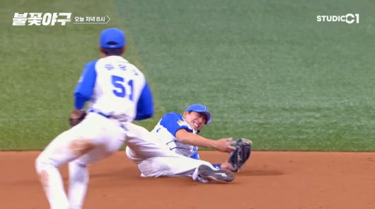 '불꽃야구' 문교원 씨의 안타성 타구를 '천재 유격수' 김재호가 명품 수비로 막아낸다. 일부 관중은 눈물을 흘릴 정도의 호수비에 불꽃 파이터즈와 인하대학교의 맞대결 결과가 궁금증을 더한다.
