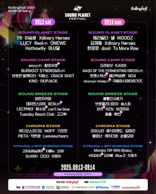 음악의 성지 롤링홀이 30주년을 기념해 개최하는 ‘사운드플래닛페스티벌 2025’에 트랜스픽션, 할로우잰, 류수정 등이 포함된 총 9팀의 라인업을 발표했다.