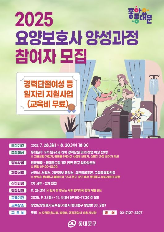동대문구는 28일 관내 거주하는 만 64세 이하 경력단절 및 미취업 여성 20명을 대상으로 ‘요양보호사 양성과정’ 참여자를 모집한다고 밝혔다.