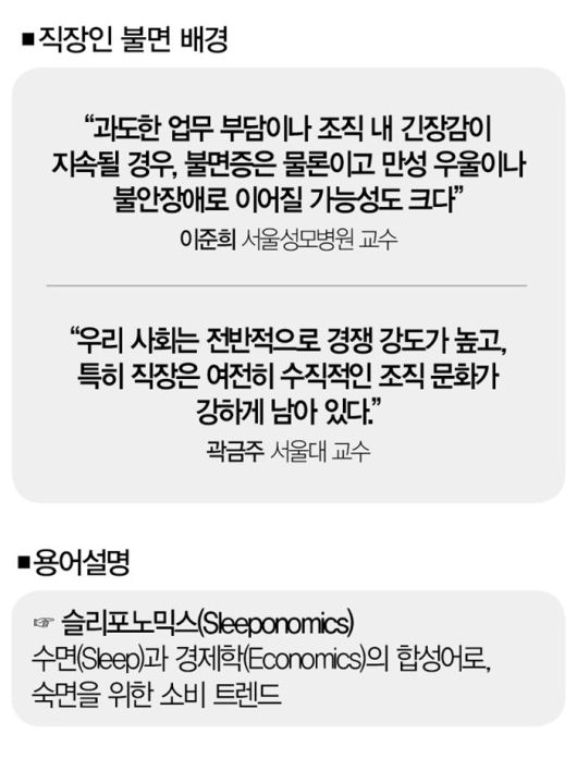 그렇다면 직장인이 잠을 이루지 못하는 이유는 뭘까. 수면을 방해하는 요소로는 과도한 스마트폰 사용, 카페인 섭취, 불규칙한 수면 습관 등이 꼽힌다. 누군가는 '생활 습관을 고치면 된다'고 말할지 모르지만, 그렇지 않다. '나쁜 수면'의 원인은 직장 내 긴장감, 업무 스트레스 등 구조적 요인들과 맞닿아 있다.