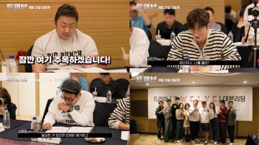STUDIO X+U 새 시리즈 '트웰브'(감독 강대규·한윤선) 제작진은 28일 주역 배우 마동석 서인국 성동일 이주빈 고규필 강미나 성유빈 안지혜 등이 참석한 대본 리딩 현장 영상을 공개했다. 배우들의 유쾌한 '케미'가 담겨 본방송에 대한 기대감을 높였다.