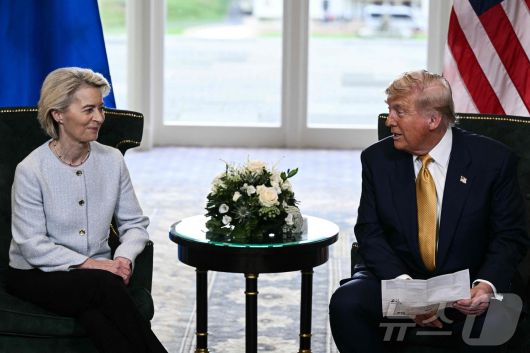 도널드 트럼프 미국 대통령(오른쪽)이 27일(현지시간) 영국 스코틀랜드 남서부 턴베리에서 우르줄라 폰데어라이엔 유럽연합(EU) 집행위원장과 회담 후 EU에 대한 상호관세와 자동차 관세를 15%로 낮추는 내용의 합의를 발표하고 있다. 2025.07.27 ⓒ AFP=뉴스1 ⓒ News1 류정민 특파원 |
