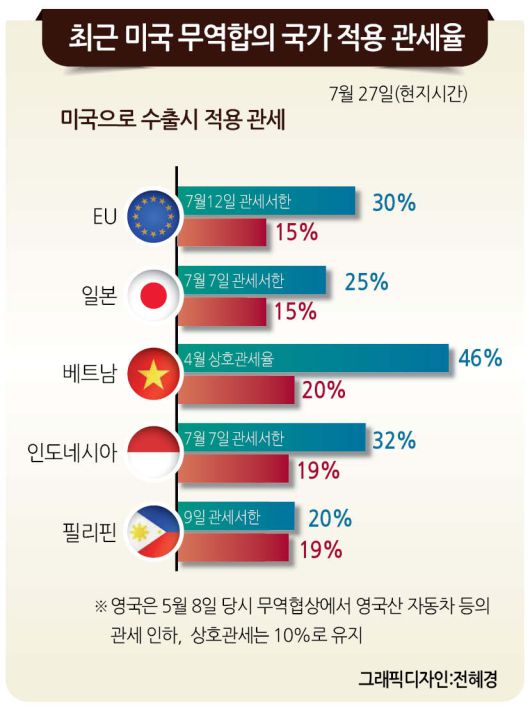▶EU와 일본, 자국 무역 핵심 내놓으며 ‘15%’ 집착=이렇게 자국 무역의 핵심을 내주는 극약 처방으로 간신히 관세 ‘15%’라는 수치를 지킨 것이다. 자국민에 대한 ‘눈 가리고 아웅’이라는 비판이 나오는 이유다. 미국의 관세 협상 시한은 오는 8월 1일까지다. 시한 마감을 닷새 앞두고 관세 15%에 합의한 EU는 일단 안도하는 분위기다.